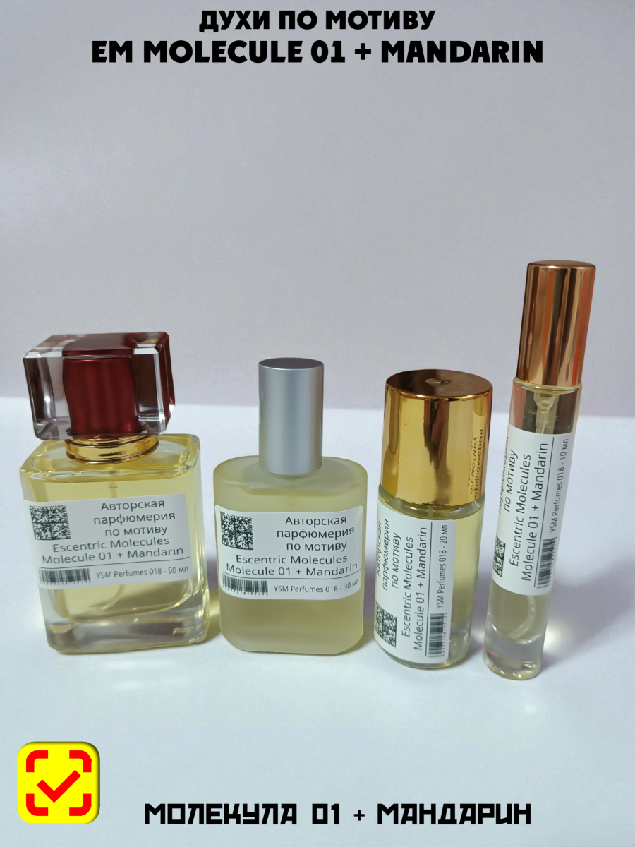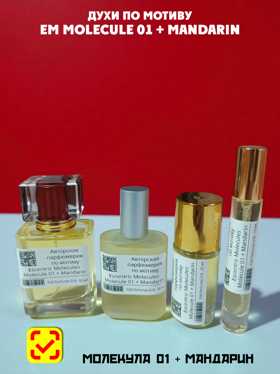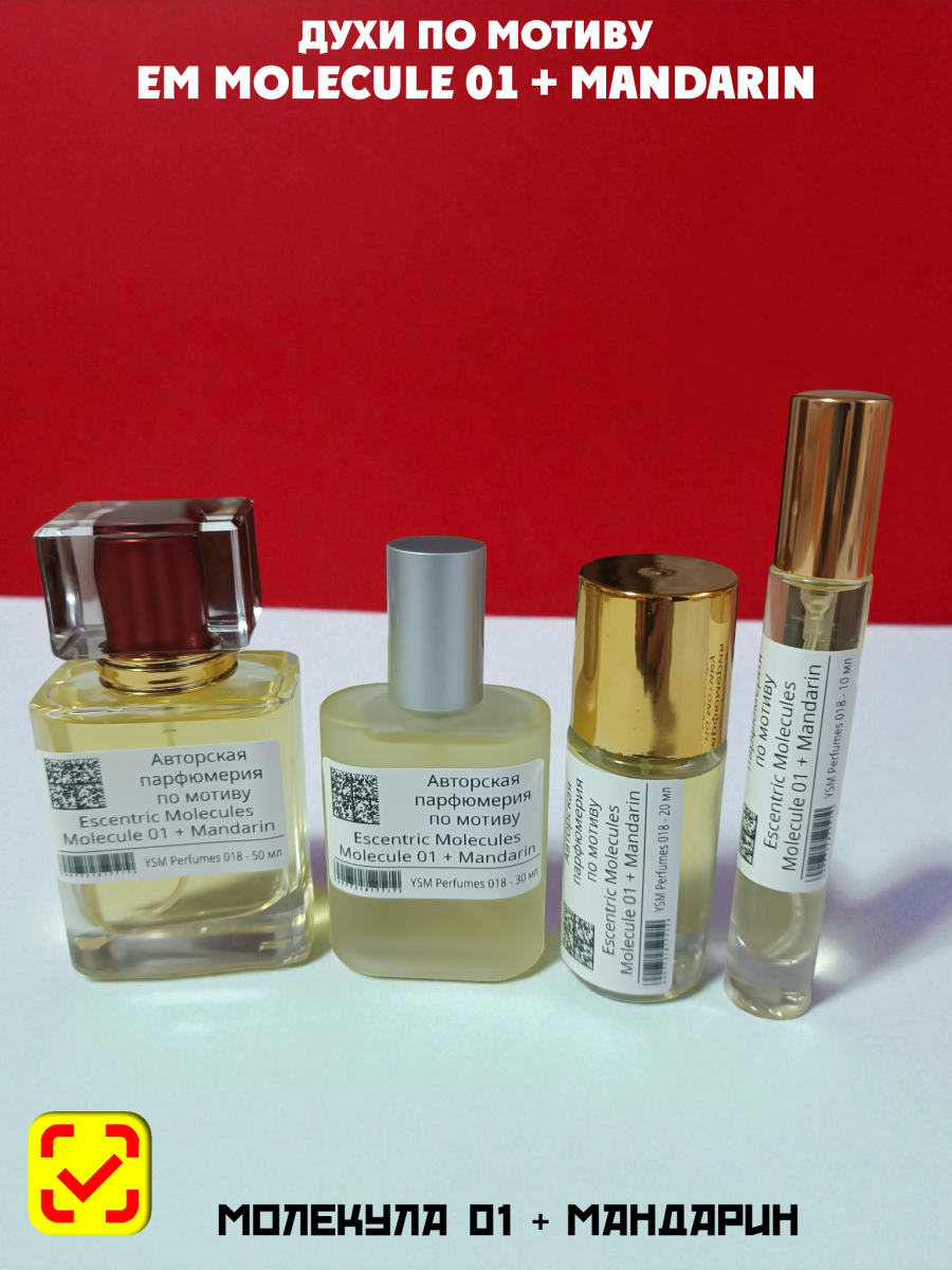 Старт: Мгновенный и мощный цитрусовый взрыв. Очень натуралистичный, сочный, кисло-сладкий. Развитие: Цитрус здесь держится дольше, чем в классических одеколонах, благодаря фиксирующим свойствам Iso E Super, но со временем он начинает стихать, уступая место древесной мягкости. Мандарин становится более акварельным и прозрачным. Шлейф: В остатке (через несколько часов) на коже остается фирменный, уютный, древесно-мускусный кокон Molecule 01 с легким, едва уловимым эхом фруктовой свежести.